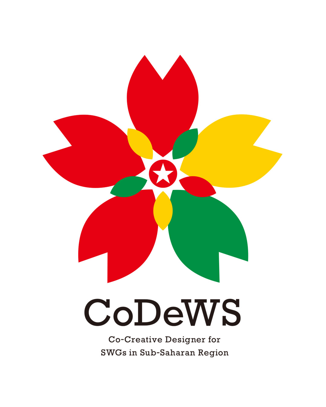 中心には、両国旗のフォルムである「●と★」を重ね、両者が中心となって展開していくことを表現。このプログラムにおいて育った共創デザイナーが、サブサハラ諸国のSWGs実現を牽引していく、すなわち花が咲いていく(開いていく)ことをイメージしたデザインです。カラーは両国旗の色をベースにしています。